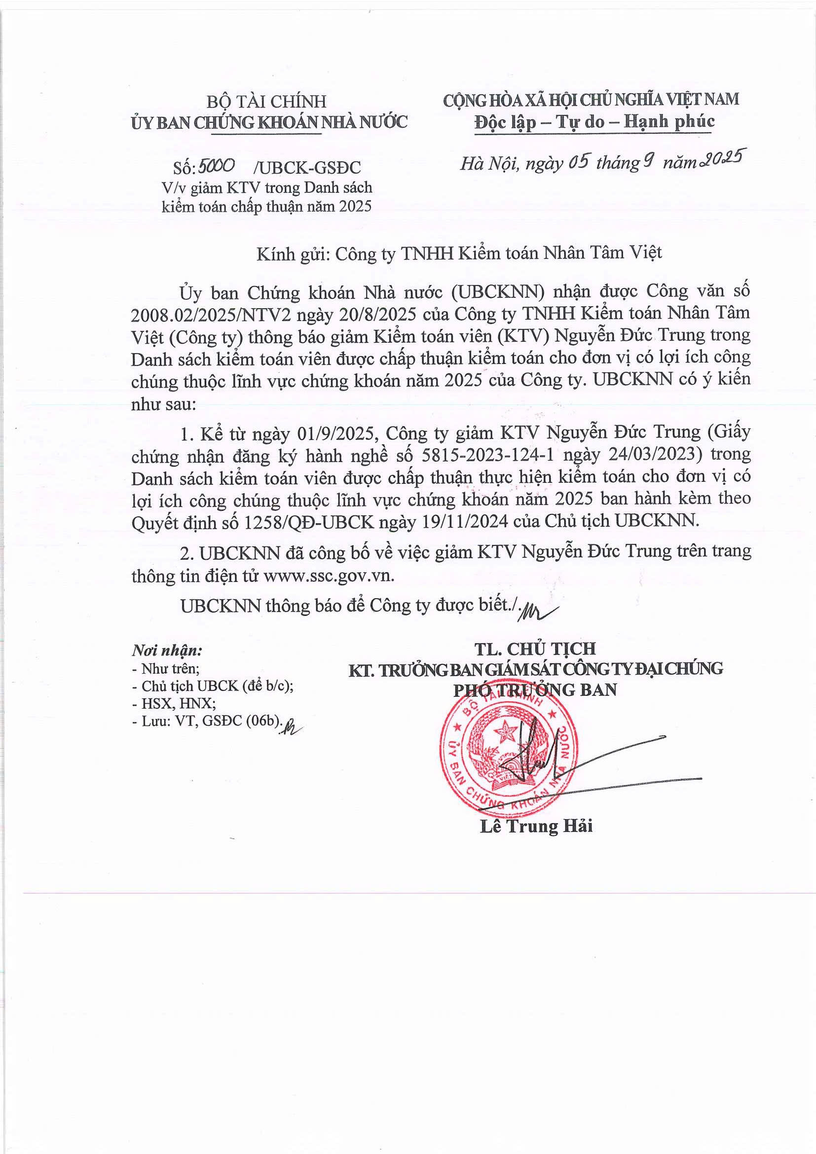 Thông báo Giảm kiểm toán viên được chấp thuận kiểm toán cho đơn vị có LICC thuộc Lĩnh Vực Chứng khoán năm 2025 (Nguyễn Đức Trung)