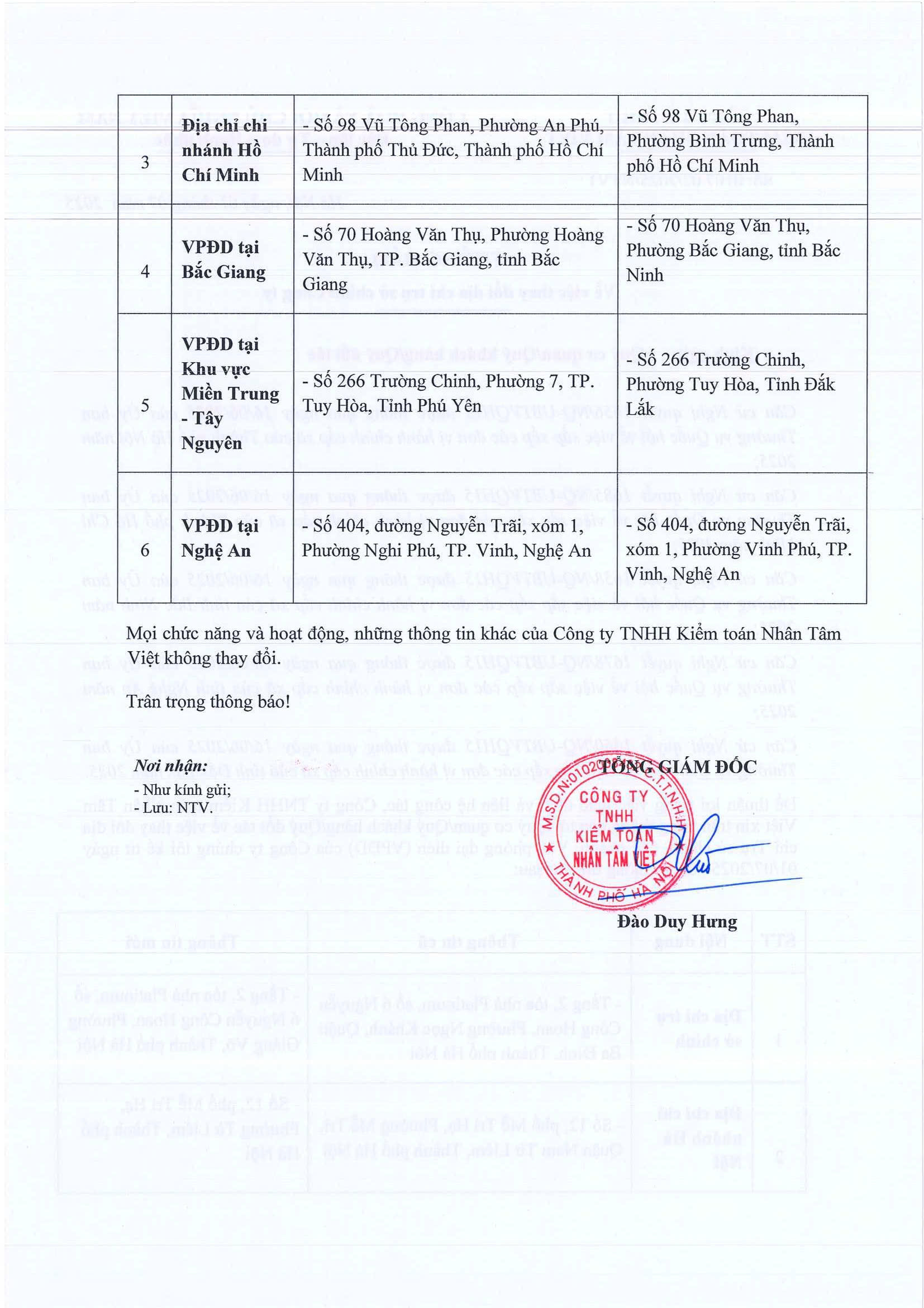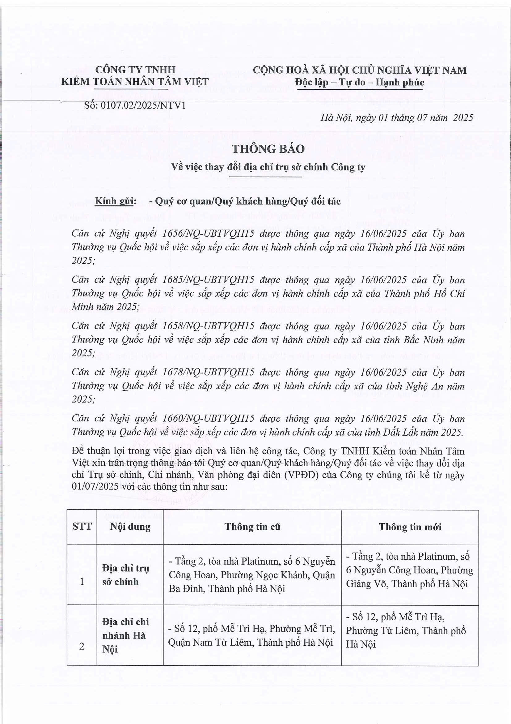 Thông báo về việc thay đổi địa chỉ trụ sở chính Công ty theo tên gọi của đơn vị hành chính mới
